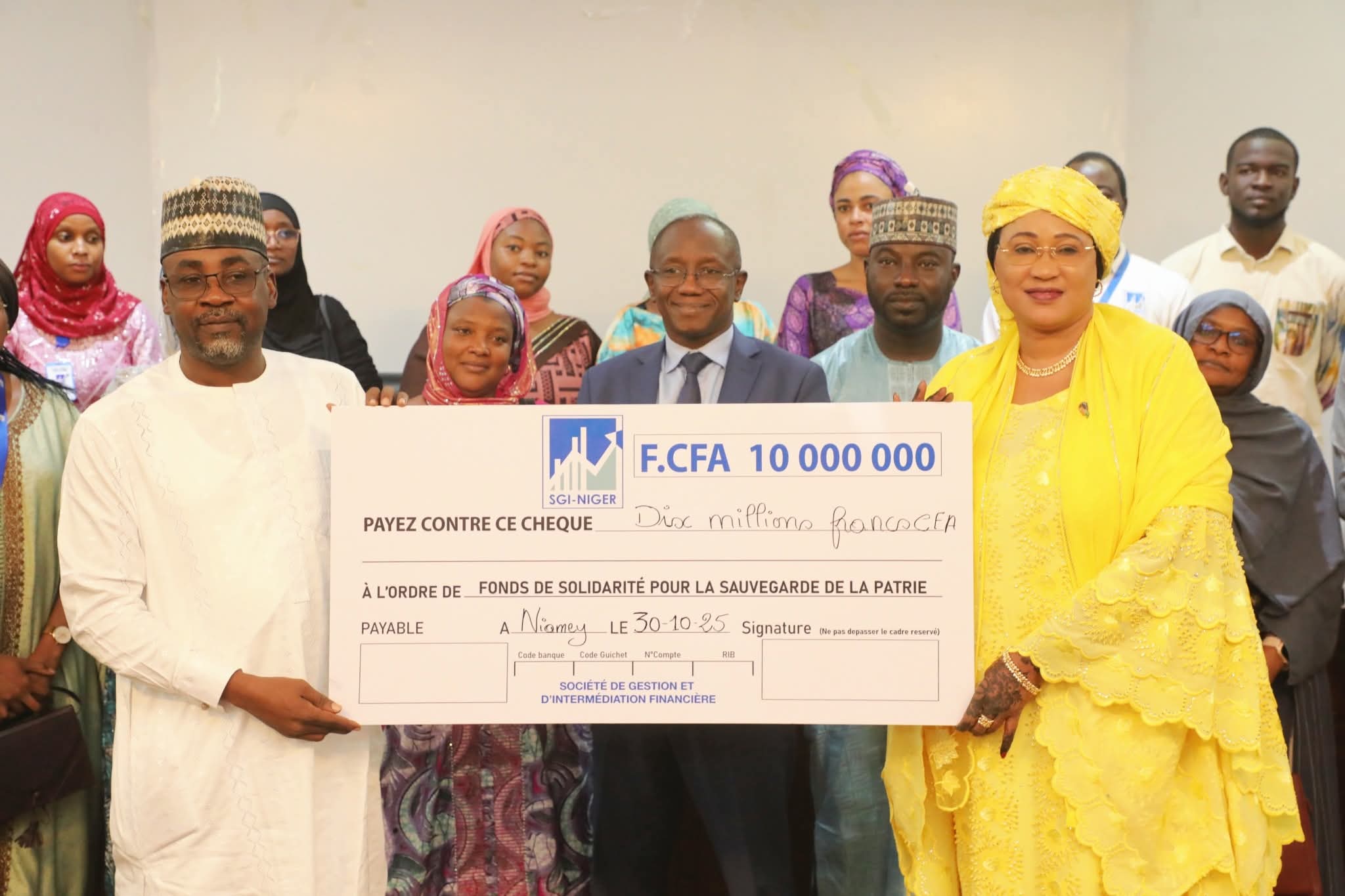 Niamey, le 30 octobre 2025 — FSSP.La Société de Gestion et d’Intermédiation du Niger (SGI-Niger) a marqué, ce jeudi matin, son engagement patriotique en apportant une contribution significative au Fonds de Solidarité pour la Sauvegarde de la Patrie (FSSP). La cérémonie de remise a eu lieu au Palais des Congrès de Niamey, en présence de la Présidente du Comité de Gestion du FSSP, Mme Réki Moussa Hassane Djermakoye, Épouse Brah Ali.Au cours de cette cérémonie, les responsables de la SGI-Niger, première société de gestion et d’intermédiation financière du pays, ont remis un chèque d’un montant de 10 millions de francs CFA au profit du FSSP. Ce geste traduit la réponse concrète de l’institution à l’appel historique lancé à Tillabéri par le Président de la République, Chef de l’État, le Général d’Armée Abdourahamane Tiani, invitant chaque citoyen et chaque structure à participer à l’effort collectif de défense et de sauvegarde de la Patrie.Dans le même élan de solidarité, le personnel de la SGI-Niger a tenu à s’associer à cette action patriotique en offrant une contribution additionnelle de 1 620 000 francs CFA. Une marque d’engagement citoyen saluée par la Présidente du FSSP, qui a exprimé sa gratitude pour ce double geste symbolique et fort de sens.Il convient de rappeler que la SGI-Niger est membre de la Bourse Régionale des Valeurs Mobilières (BRVM), et qu’à travers cet acte, elle réaffirme sa volonté de participer activement au développement économique et social du Niger dans un contexte où la solidarité nationale est plus que jamais essentielle.
