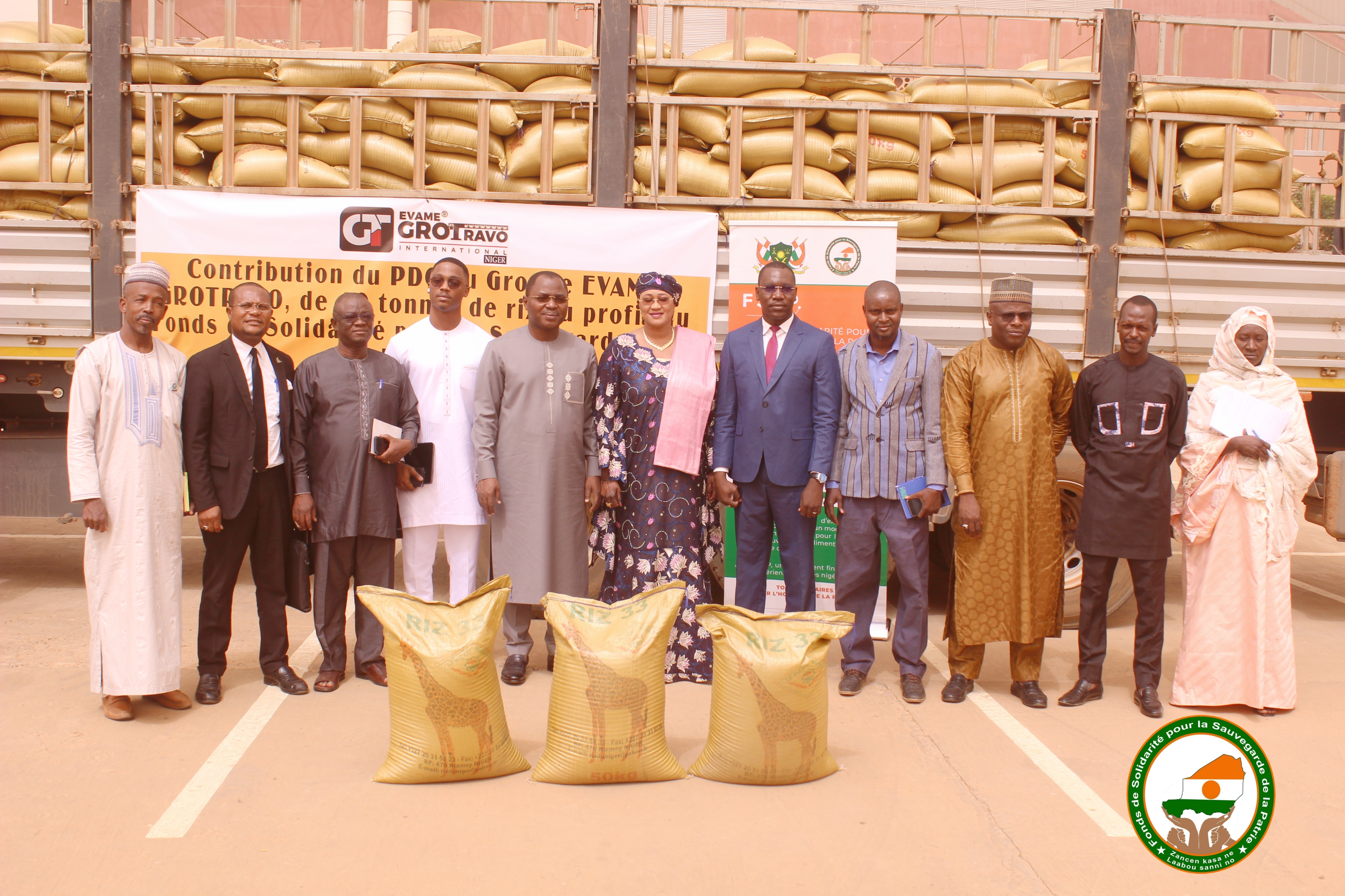 D’une part, dans le parking du centre de conférences Mahatma Gandhi, une réception symbolique a été organisée pour accueillir une contribution exceptionnelle de 40 tonnes de riz, d’une valeur de 18.000.000 FCFA. Ce geste généreux émane d’un ami du Niger, le PDG du groupe EVAME GROTRAVO, originaire du Togo. Cette contribution remarquable souligne l’importance de la coopération et de l’amitié entre les nations voisines.