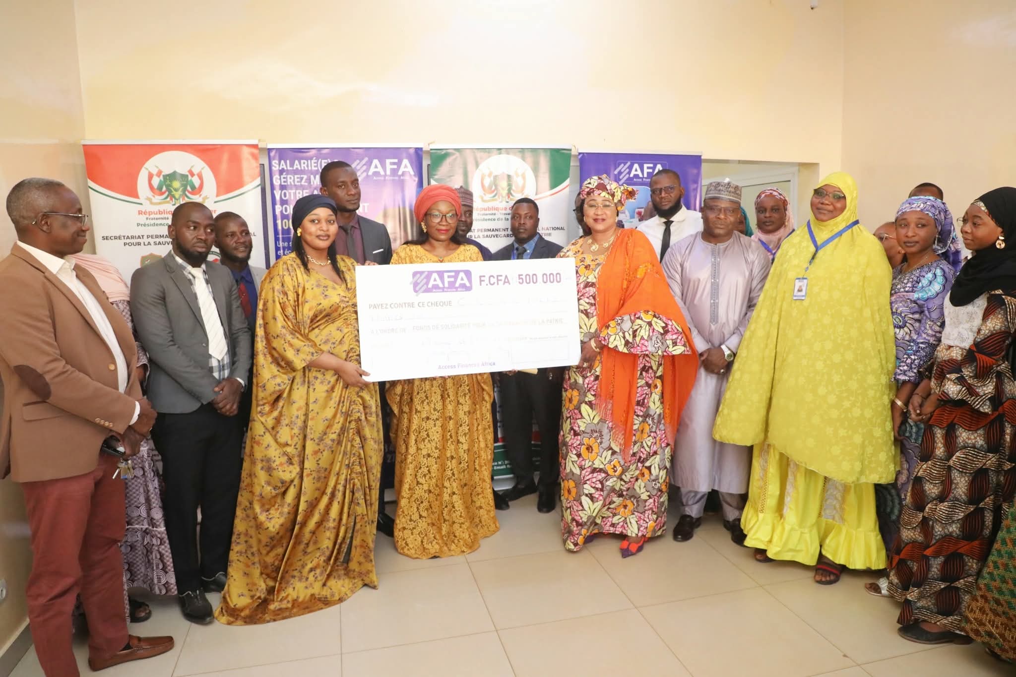Niamey, le 28 octobre 2025— FSSPAccess Finances Africa (AFA), institution de microfinance bien connue dans la place, a procédé à la remise de sa contribution au Fonds de Solidarité pour la Sauvegarde de la Patrie (FSSP). Ce geste patriotique du personnel, des responsables et des partenaires de l’institution s’inscrit dans le cadre de la mobilisation nationale initiée par le Président de la République, Chef de l’État, le Général d’Armée Abdourahamane Tiani.Au total, un montant de 792 000 F CFA a été versé au profit du FSSP, réparti comme suit :Personnel : 250 000 F CFAAccess Finances Africa (AFA) : 500 000 F CFAAbdoul Aziz Lawali, Directeur Financier : 14 000 F CFAGroupements féminins partenaires de AFA : 28 000 F CFAEn prenant la parole au nom de l’institution, les responsables de AFA ont exprimé leur engagement à soutenir les efforts du gouvernement pour la sauvegarde de la patrie et la consolidation de la paix.En réceptionnant, Mme Réki Moussa Hassane Djermakoye, Présidente du Comité de Gestion du FSSP, a salué ce geste hautement patriotique, témoignant de l’esprit de solidarité et d’unité nationale qui anime les Nigériens face aux défis actuels.