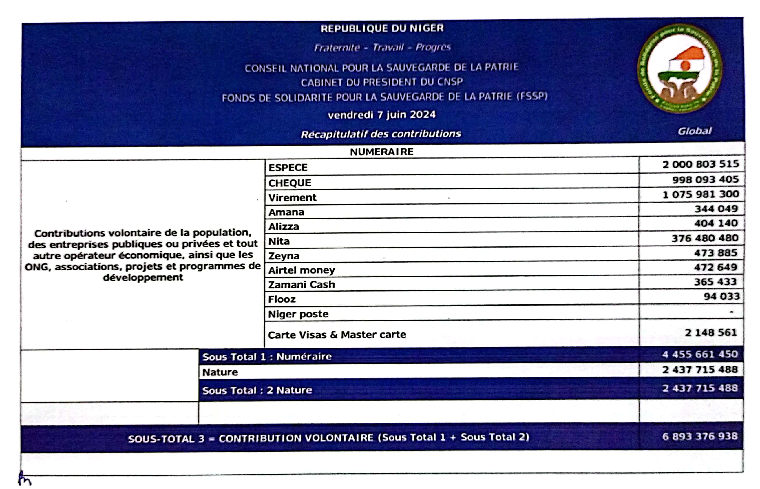 Nous invitons tous les citoyens à consulter le reporting et le récapitulatif des contributions au Fonds de Solidarité pour la Sauvegarde de la Patrie en ligne sur www.fssp.ne , et à continuer à soutenir cette noble cause qui est l’affaire de tous. Ensemble, nous sommes plus forts.