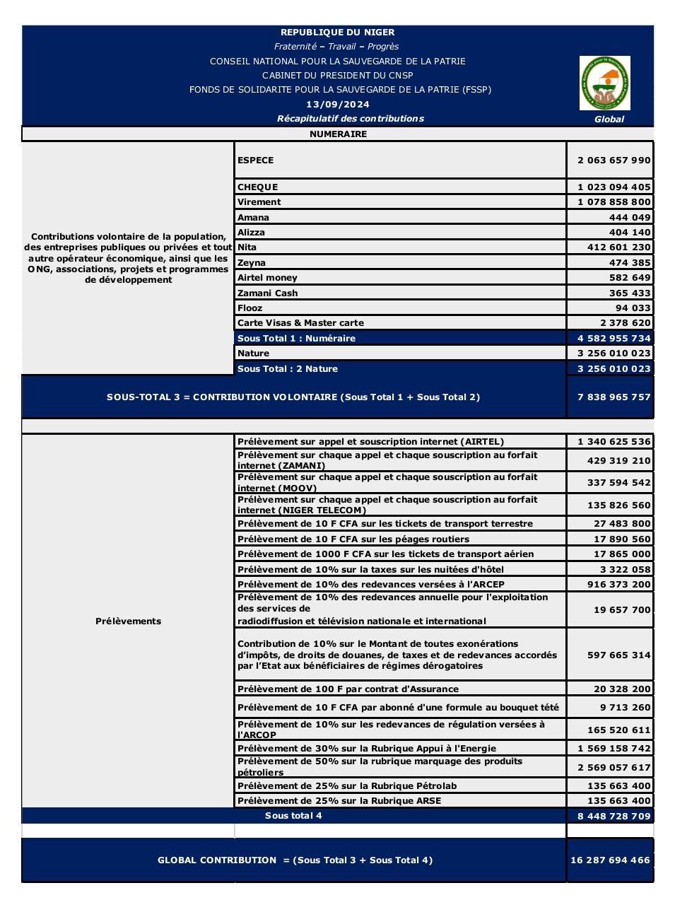 Nous invitons tous les citoyens à consulter le reporting et le récapitulatif des contributions au Fonds de Solidarité pour la Sauvegarde de la Patrie en ligne sur www.fssp.ne , et à continuer à soutenir cette noble cause qui est l’affaire de tous. Ensemble, nous sommes plus forts.
