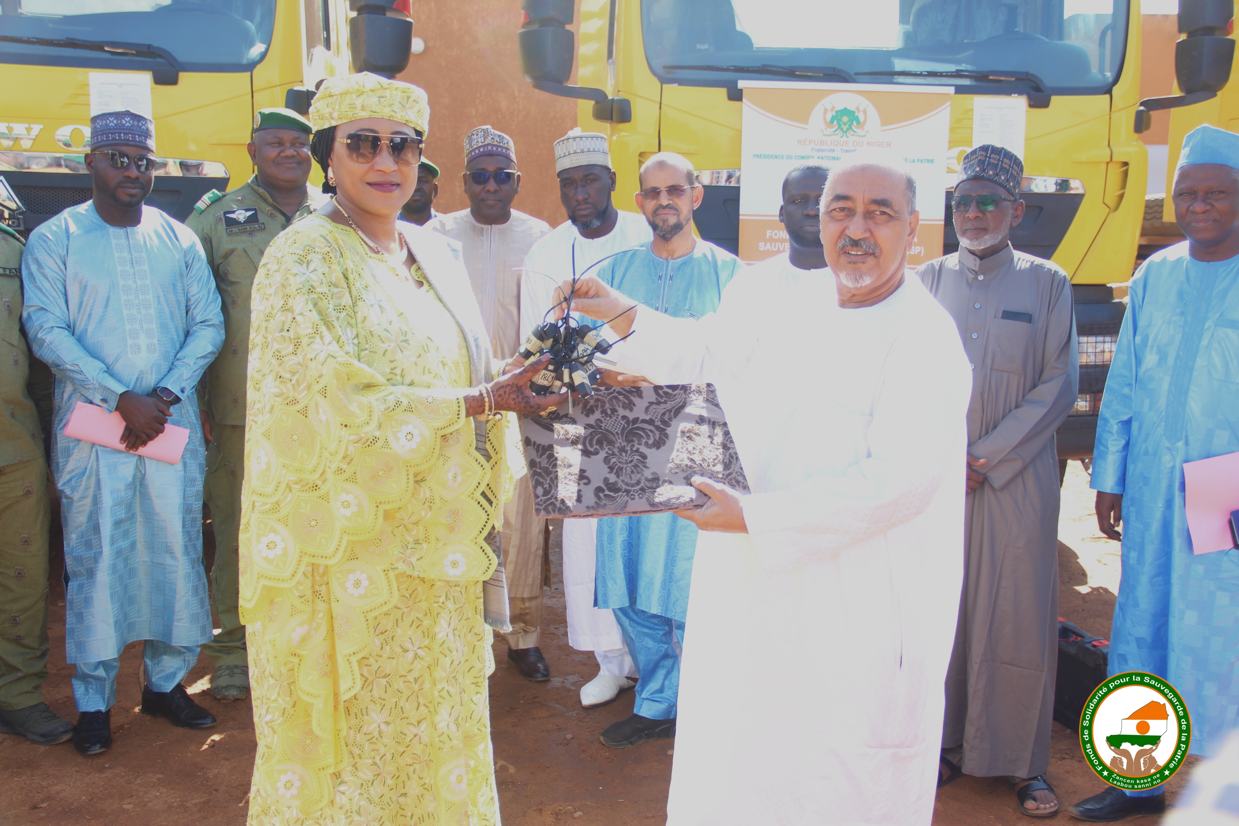 La Présidente du FSSP, Mme Réki Moussa Hassane épouse Brah, a officiellement réceptionné les clés des 5 tracteurs Sinotruk d’une valeur de 185.000.000 FCFA, offerts par les importateurs nigériens, des mains du président de la Chambre de Commerce.