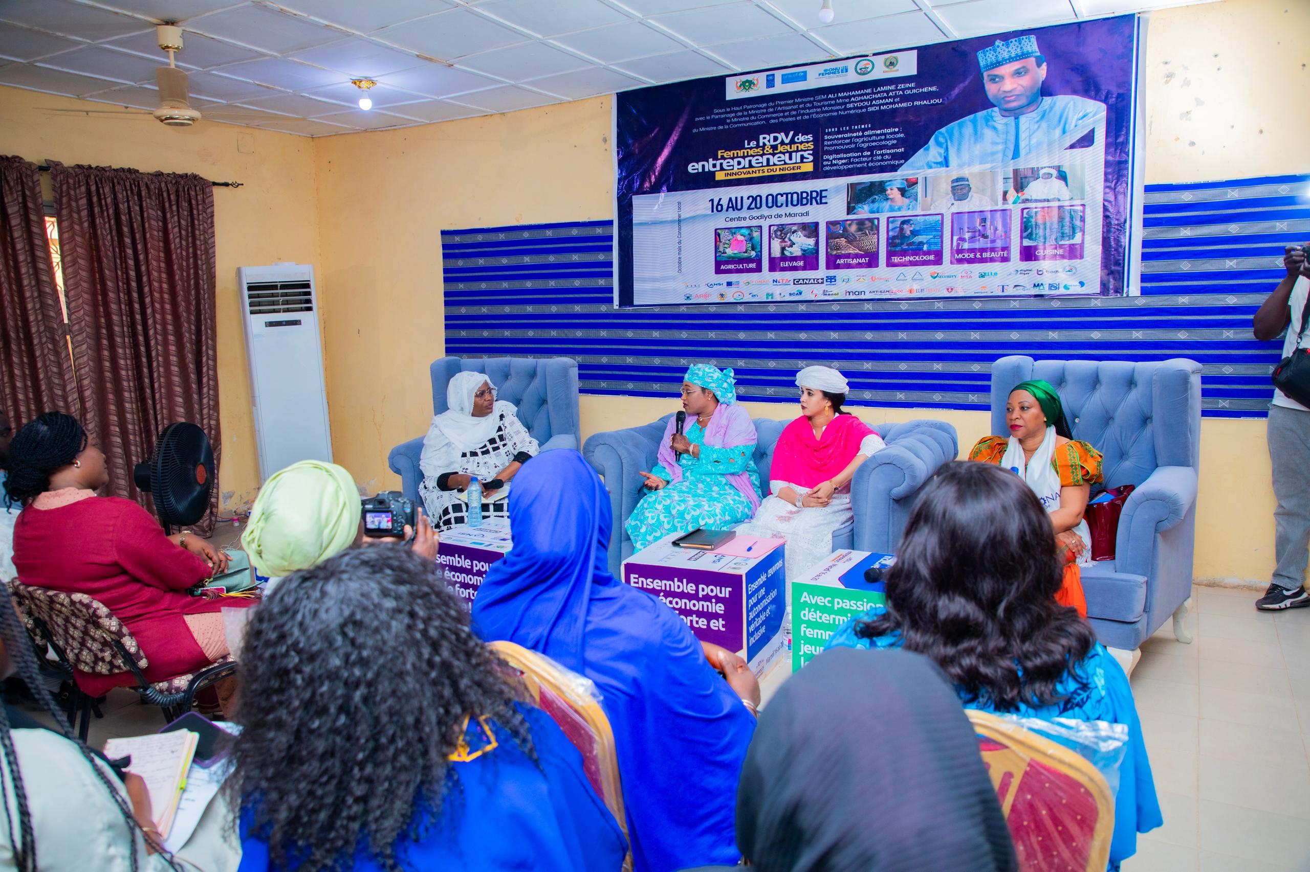 Dans l’après-midi la Présidente du Comité de gestion du FSSP a co-animé avec la Ministre de l’Artisanat et du Tourisme, la Représentante Résidente du PNUD au Niger, un panel de haut niveau sur le thème: » Investir dans les femmes du Niger pour accroître leur résilience face aux effets du changement climatique « .