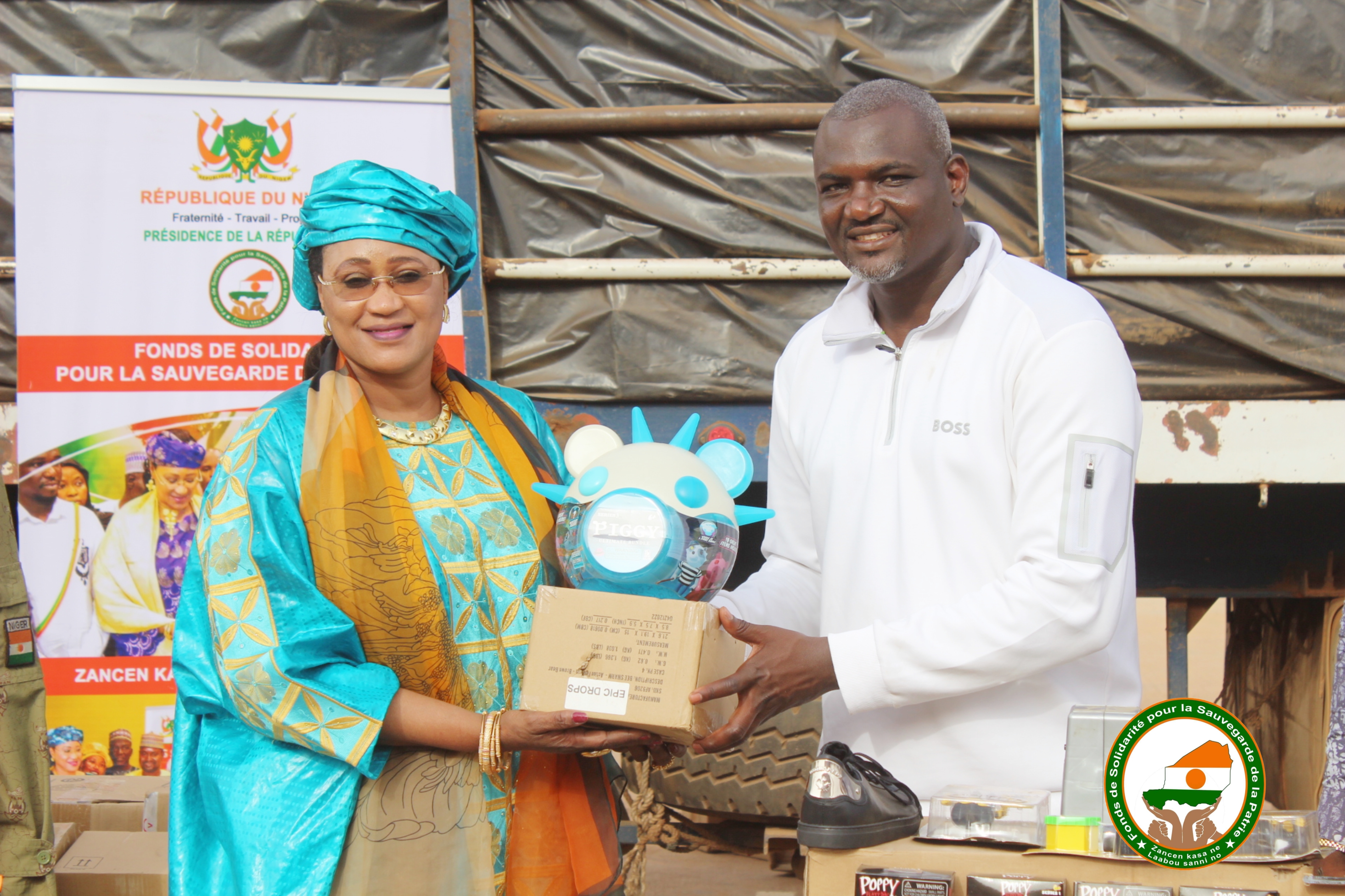Dans l’après-midi du mercredi 19 juin, un événement significatif a eu lieu au siège du Comité de Gestion du Fonds de Solidarité pour la Sauvegarde de la Patrie. La présidente du comité 𝐌𝐚𝐝𝐚𝐦𝐞 𝐁𝐫𝐚𝐡 𝐑é𝐤𝐢 𝐃𝐣𝐞𝐫𝐦𝐚𝐤𝐨𝐲𝐞, a officiellement réceptionné une importante contribution en nature de la part de la Fondation Afrikicks, dirigée par l’humanitaire Oumarou Idrissa.