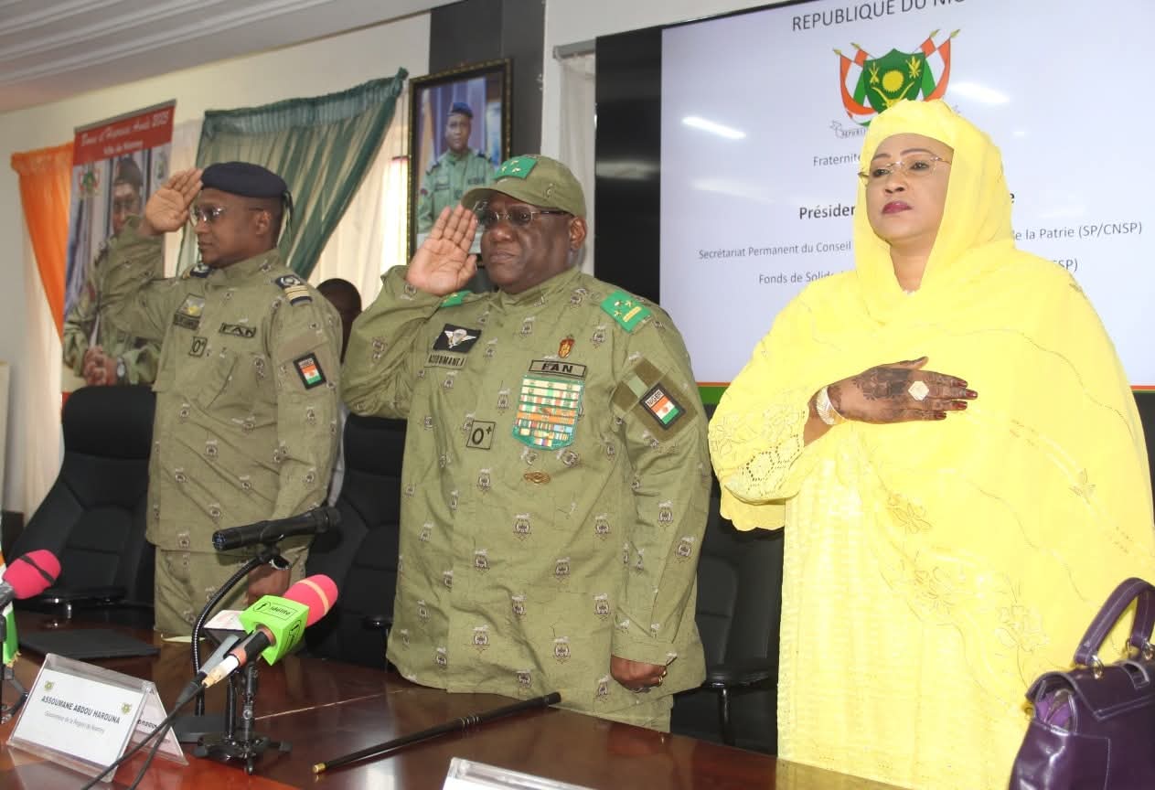 Niamey, le 13 novembre 2025 – FSSP ,Sur invitation de la Présidente du Comité de Gestion du Fonds de Solidarité pour la Sauvegarde de la Patrie (FSSP), Madame Reki Moussa Hassane Djermakoye, le Gouverneur de la région de Niamey, le Général de Division Assoumana Abdou Harouna, a présidé ce jeudi la cérémonie de lancement officiel de la mission de vulgarisation de la nouvelle ordonnance du FSSP.La rencontre s’est tenue dans la salle de conférence de l’Hôtel de Ville de Niamey, en présence de l’Administrateur central de la ville, le Colonel Boubacar Soumana Garanké, des administrateurs délégués des cinq arrondissements communaux, des secrétaires généraux des communes, de plusieurs chefs coutumiers, représentants de la société civile, d’organisations féminines et d’un large public invité.Cette mission vise à expliquer, informer et sensibiliser la population sur le contenu et la portée de la nouvelle ordonnance n°2025-35 du 22 octobre 2025, afin de favoriser son appropriation par tous les citoyens.Dans son mot de bienvenue, l’Administrateur délégué de la ville de Niamey a salué l’initiative, soulignant l’importance de cette démarche participative pour renforcer la compréhension et l’adhésion des populations.Prenant la parole, le Gouverneur de la région de Niamey a rappelé le rôle déterminant du FSSP dans le soutien à l’effort de guerre et à la résilience nationale. Il a invité l’ensemble des acteurs régionaux à maintenir la dynamique de solidarité et d’engagement patriotique : « La région de Niamey, fidèle à sa tradition d’unité et de patriotisme, réaffirme son engagement à accompagner cette initiative louable », a-t-il déclaré.Dans son intervention, Madame Reki Moussa Hassane Djermakoye a, quant à elle, présenté de manière détaillée les innovations introduites par la nouvelle ordonnance, qui abroge et remplace celle du 11 octobre 2023. Elle a expliqué que cette révision permet de renforcer les capacités de financement interne du combat pour la sauvegarde de la Patrie et la reconquête de la souveraineté nationale, conformément à la vision du Conseil National pour la Sauvegarde de la Patrie (CNSP).La Présidente du Comité de Gestion a enfin exhorté tous les acteurs à s’approprier le contenu de la nouvelle ordonnance et à relayer fidèlement les messages du FSSP auprès des populations.