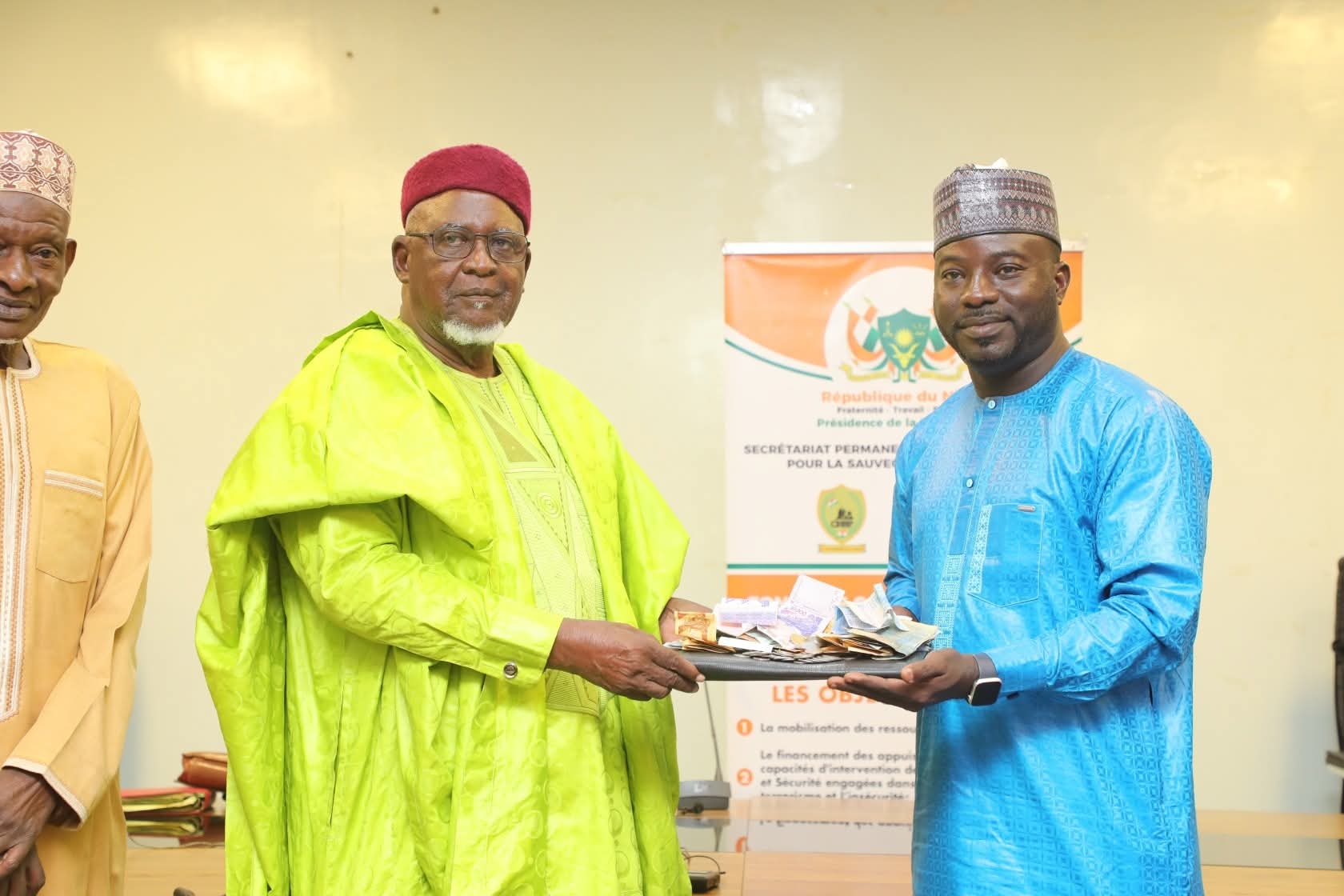 Lancement d’une collecte au profit du FSSPNiamey, le 04 novembre 2025 – FSSPSur invitation de l’Union des Retraités du Niger (civils et militaires), le Vice-président du Comité de Gestion du Fonds de Solidarité pour la Sauvegarde de la Patrie (FSSP), M. Brah Amadou, a pris part ce matin, à la Mutuelle de la Garde et de la Police nationale, à la cérémonie de lancement d’une collecte de contributions en réponse à l’appel du Président de la République, Chef de l’État, le Général de Corps d’Armée Abdourahamane Tiani.Dans une ambiance empreinte de patriotisme et de solidarité, les anciens serviteurs de la Nation ont, de manière spontanée, mobilisé une somme de 252 235 f CFA, en guise de contribution au FSSP. Ce geste illustre une fois de plus l’attachement indéfectible des retraités aux valeurs de défense, d’unité et de solidarité nationale.Très ému par cette forte mobilisation, le Président de l’Union, le Commandant Oumarou Garba, a salué la générosité et l’esprit de patriotisme de ses pairs, tout en réaffirmant la détermination des retraités à soutenir les Forces de Défense et de Sécurité.À travers cette initiative, les retraités civils et militaires tiennent à rappeler qu’ils ne sauraient rester en marge de l’effort collectif engagé pour la sauvegarde de la Patrie. Leur contribution vient renforcer la dynamique nationale de solidarité, symbole de l’unité du peuple nigérien autour de ses Forces de Défense et de Sécurité.
