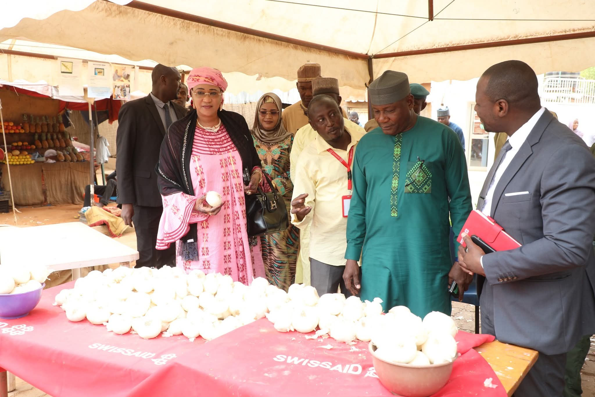 La présidente du Fonds de Solidarité pour la Sauvegarde de la Patrie, accompagnée des membres du Comité de gestion, a effectué ce jour une visite guidée de l’exposition de la Foire de l’oignon blanc de SOUKOUKOUTANE, organisée au siège de l’organisation internationale SWISSAID.