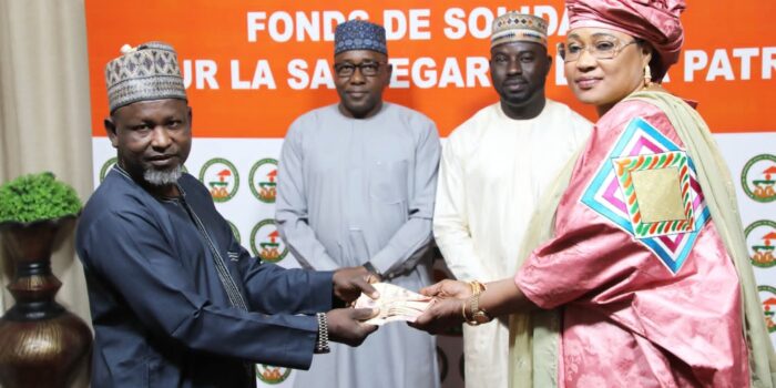 Niamey, le 26 janvier 2026 – FSSPLa Présidente du Comité de Gestion du Fonds de Solidarité pour la Sauvegarde de la Patrie (FSSP), Mme Reki Moussa Hassane Djermakoye, a réceptionné, ce lundi matin, plusieurs contributions émanant de bonnes volontés.Ces gestes patriotiques des Nigériens s’inscrivent dans le cadre de la réponse à l’appel du Président de la République, Chef de l’État, en faveur de l’effort de guerre.Il s’agit notamment des contributions de :- La classe 84 des FDS, 590.000 f CFA – Le Groupement des handicapés Révolution Continue au Sahel, 11.000 f CFA – Caporal Garba Mamane, retraité domicilié à Djambala, 2000 f CFA – Le Groupement Zoumunci Addar, 375.000 f CFA – Ressortissants Nigériens en Arabie saoudite, 800 Riyal Saoudien, a peu près 160.000 f CFA.